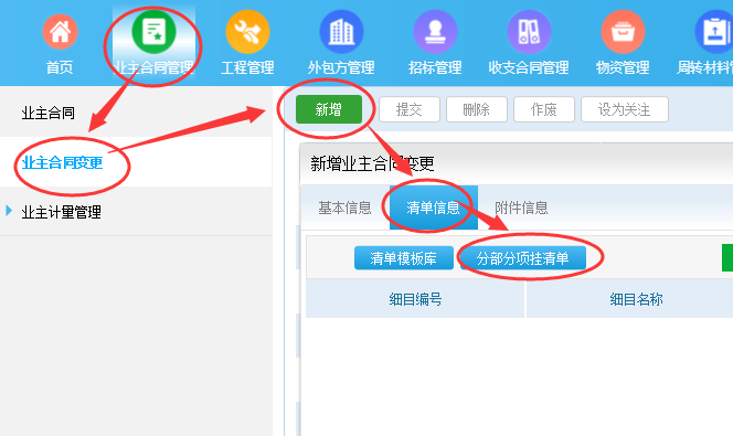 分部分项和挂清单是跟业主 的分部分项一样的哈!不是分包合同的拆分清单,如果分包合同的清单项 跟业主的不一样的是在预算那里拆分清单哈!注意只是分包清单不一样才拆分哈!比如分包清单跟业主的一样只是把数量分包给 2家协助队伍,单价一样或不一样的这些都不需要再拆分项哈!这跟老系统不一样哦