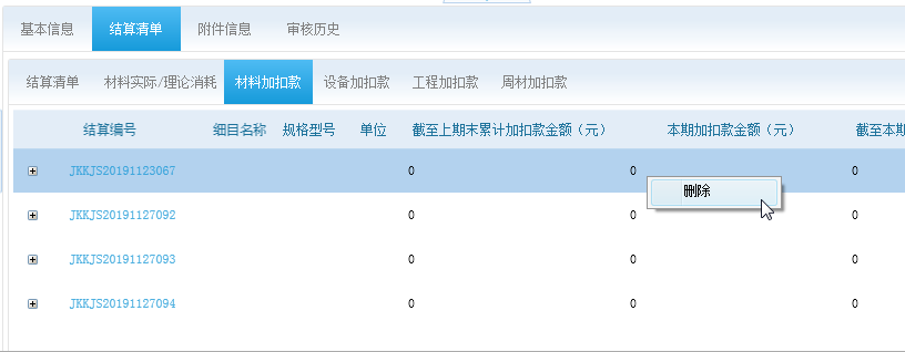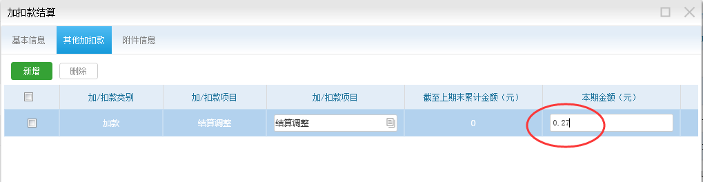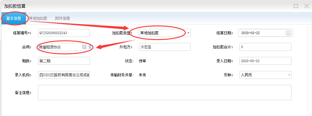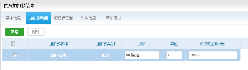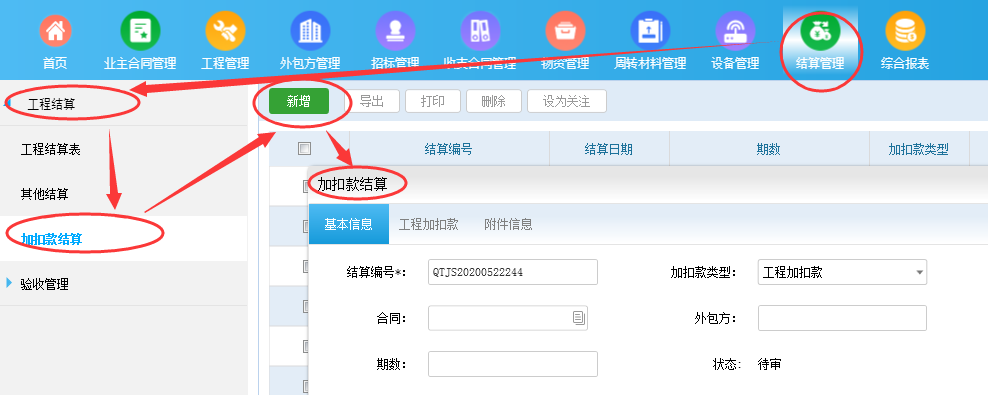 暂时加扣款新增后状态为待审核状态,当你做工程结算和其他结算的时候会根据合同自动汇进,此时 加扣款为已汇总状态(不允许修改),提交工程结算和其他结算审核完成后,加扣款自动变成已审核状态。 如果加扣款已汇总但是要修改,要先删掉工程结算和其他结算后才能修改。