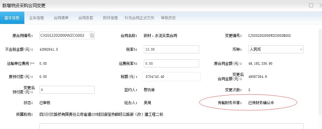截图中的这个变更,就是已经上传了正式文件,但还正在等待 共享财务确认合同