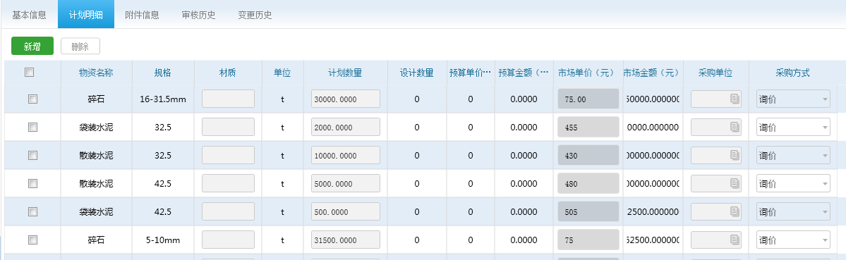 工程管理 -> 预算变更 ->新增 -> 清单中可以看到,原细目203-1-c 数量已经变更为 999,单价未变;新细目203-1-z 数量为 88000,单价为新单价 6.75;