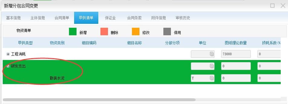 做 分包合同的变更,把 水泥这种物资添加到 甲供-研发支出 这里面去。以后才能按 研发支出 进行消耗。
